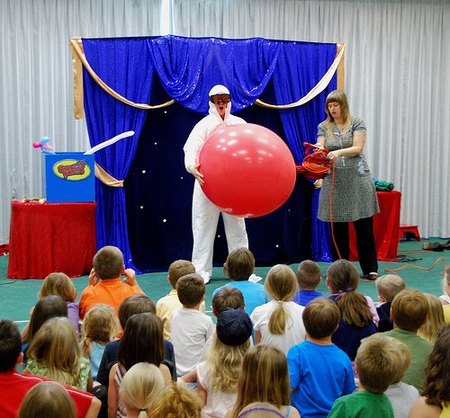 Since June 4th, Miss Dena and I have been traveling to libraries all over Illinois performing our unique stage production, the Smarty Pants Big Balloon Show. Our library show features magic, comedy and the world’s largest balloon props – and libraries are one of our favorite places to perform. We always enjoy seeing sold-out audiences of appreciative fans for our show, especially when visiting new libraries like our recent visit to the Crete Public Library!