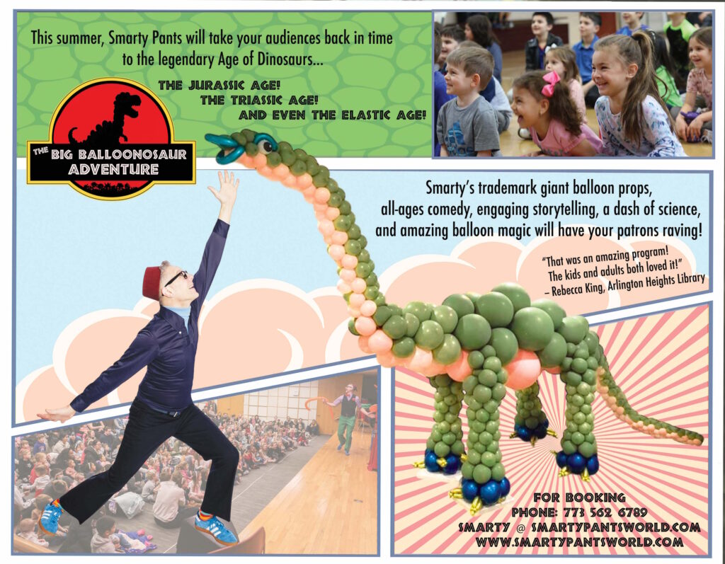 Created to fit the upcoming CSLP 2026 theme, “Unearth a Story!” this new Big Balloon Show program features magic, all-ages comedy, Smarty’s trademark giant dinosaur sized balloon props and of course, a hearty dash of paleontology.