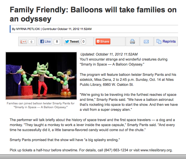 Smarty Pants and the Big Balloon Show will be making their return to the Niles Public Library for their popular “Super Sundays” program this Sunday, October 14th 2012. Showtime is 2 pm!